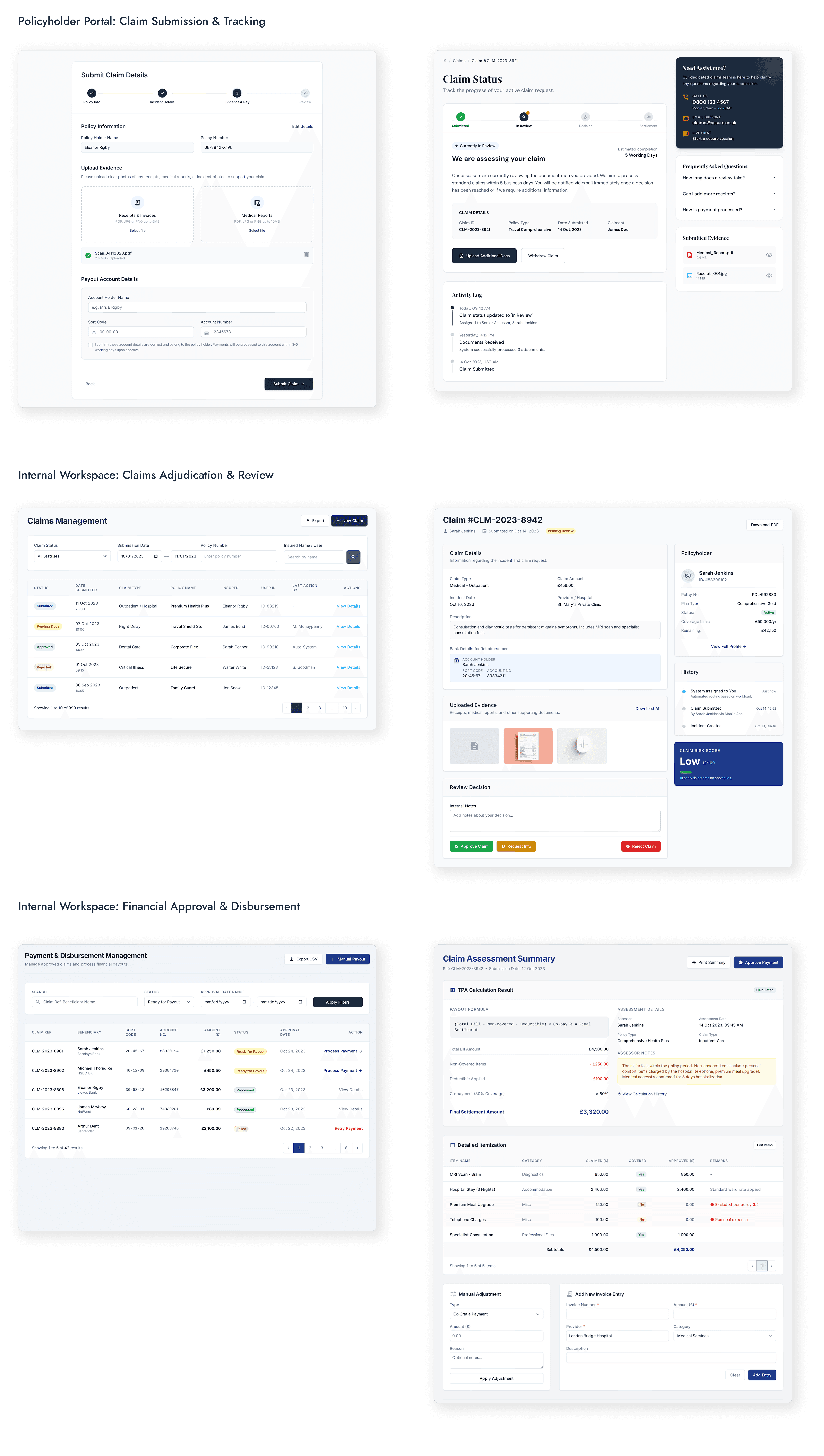 B2B Operational Workspaces: Architected high-contrast, data-centric internal dashboards. I structured complex audit timelines and settlement data into scannable interfaces for both claims adjudication and financial disbursement.